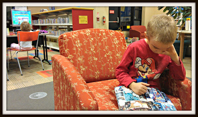 In a weird twist of fate I found myself heading to the library to pick up a real book today. So I brought the kids along to return one of their books and see if there were any books they might like to borrow. The kids love visiting the library and wont leave without picking a book or three. I loved watching Violet trying to read to a little girl. She was a little two and a half-year old who loves being read too, so she sat and listened to every book Violet ‘Read’. Today’s picture captures a moment near the end of our visit. Jacob’s reading the Justice League comic he picked and Violet is having her turn on the computer.