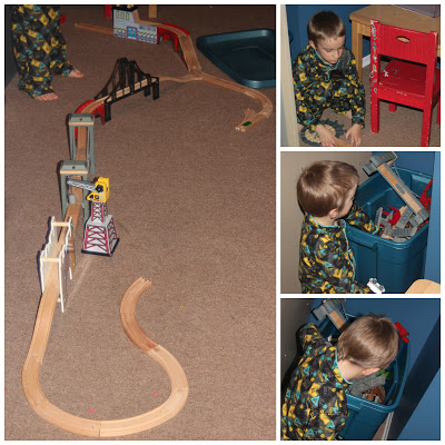 This evening Jacob did something I hadn’t seen him do in a while. He pulled out his trains and started building a track. He had an intricate design in his mind when he started and only bed time stopped him from completing it. He says he’ll continue it tomorrow, but I’m sure there will be other distractions that keeps him from it. As our family contemplates starting our spring cleaning early this year. With spring cleaning comes the purging of old toy’s and one of the things on the bubble is Jacob’s train set, but watching him tonight I wonder if I could really part with it.