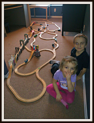 I guess Jacob’s train bug wasn’t satisfied with the track he made last night before bed. This afternoon the kids and Nan covered Jacob’s room floor with an intricate track.  From the pictures Nan took it’s clear they had fun doing it.