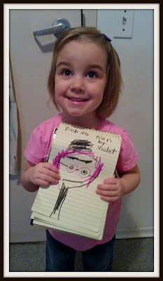 This morning before heading off to our day’s Violet showed me her latest artistic work. It’s a portrait of her grandmother. She was so proud of it that she posed with it before putting it on a place of honour on the fridge.