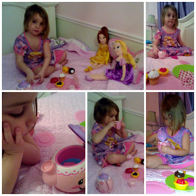 Tonight I went up stairs to check on the kids, to make sure they were still snug in their beds. What I found in Violet’s room was her sitting on the bed having a Tea Party with her Princesses. Of course she wanted me to Join her. So I did with my camera so I could capture the moment. It wasn’t a long Tea Party but it’s another moment I’ll cherish as my little girl grows up.