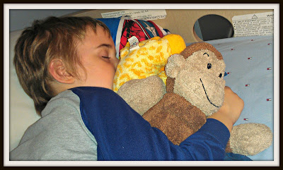 Tonight Jacob reminded me for all the growing up he’s done, he’s still a little boy. Shortly after I had tucked him in for the night, while I was listening to Violet tell me a bed time story, I heard him climb out of his bed. He came into Violet’s room and told me he couldn’t sleep because he didn’t have Coco. I told him to go back to bed, and I would find Coco once Violet was done her story. Violet’s story went on a little longer then I expected and when I finally went to Jacob’s room to find his stuffed friend, I found him already asleep with both Coco and Jeffrey. I just had to get a picture of my little man and his stuffed friends.