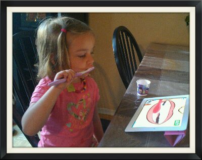 Today I worked from home and Violet surprised me while I was working away with her toothbrush and toothpaste. It seems the new TV Kids App I’d installed on the IPad had a song for the kids to brush their teeth too and she wanted to try. I was impressed at how well she setup on the table, and that her first thought wasn’t to take Melissa IPad to the bathroom.
