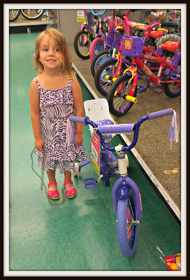 Tonight while we were at Toys’r’us to pick up a present, Violet wanted to look at the bikes. The first one we looked at was a Lalaloopsy and I thought for sure Violet would say she wanted it, but while I was trying to draw her attention to it she yelled out in delight ‘A Purple Bike!’ so I took a picture of her with it. Of course she doesn’t really need a new bike this summer. Hopefully they will have a purple on for her when it’s time to get her next bike.