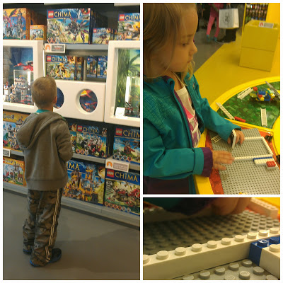 Today was a relaxing day, I wasn’t really up for a lot after yesterday’s run. So some shopping and a trip to the Lego store was about all we did. It amused me to watch how differently the kids reacted in the Lego store. Violet went right to the table where she could build. While Jacob started looking over the sets looking for different ones that he wants. I got pictures of them both and put them together for today’s Picture of the day.