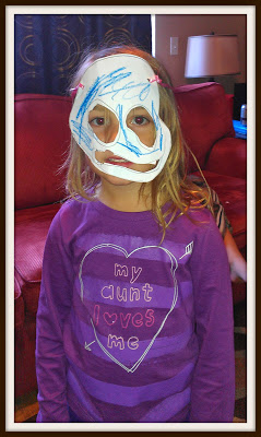 Today Violet came to me with a picture of a face on a white piece of paper and Asked me to cut it out for her. Next thing I knew I was tieing a ribbon on it and was running around showing off her mask.
