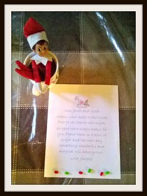 Today Jingles surprised the kids with a letter and some ‘Magic Beans’. The kids are to plant them into a bowl of sugar and the next morning something wonderful and magical will grow. Unfortunately we didn’t plant them tonight so you’ll have to wait a couple of days before seeing what grows. As I look at today’s picture I think that this month is in danger of becoming the month of Jingles,. Of course know all the exciting things we have planned in the coming days and weeks I can promise that this will not be the month of Jingles. Though I will be taking a picture of Jingles each day and posting them to my Flickr account (Link will be here when I’ve set it up).