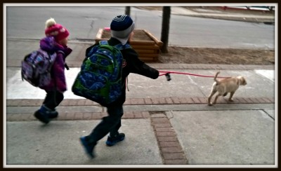 As the Ruby has gotten older and the weather gotten warmer Ruby has started joining us as we walk to school in the mornings. Today they kids wanted to hold her leash and I captured this picture as we walked. It’s nice to see Jacob taking an interest in Ruby.
