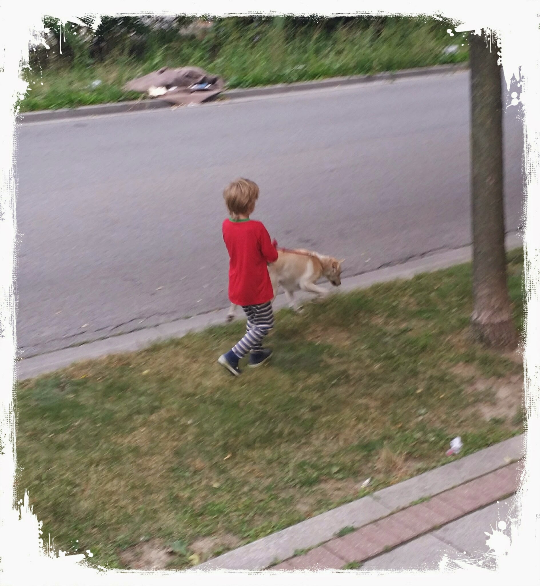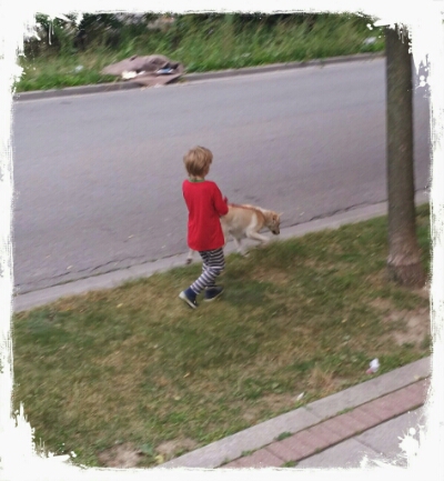 Every morning Melissa or I get up early to walk Ruby, usually we find Jacob already awake entertaining himself. This morning I came down to walk ruby and found Jacob taking her out of the door for her morning bathroom break. He insisted on doing it himself, evening picking up the poo. The only problem he had, was when Ruby saw me and wanted to run to me.