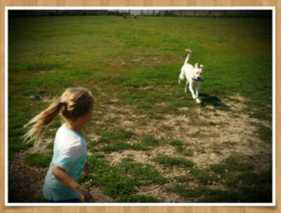 Today we spend the morning running around doing errands and the afternoon at the local park for what was supposed to be a water war. We did have a war, but the kids were quickly distracted by other kids and spent the time playing while the old folks relaxed on the grass. Between the excitement we found time to take Ruby to the dog park. We were the only ones there, but Ruby still had fun chasing her disc and playing with Violet.