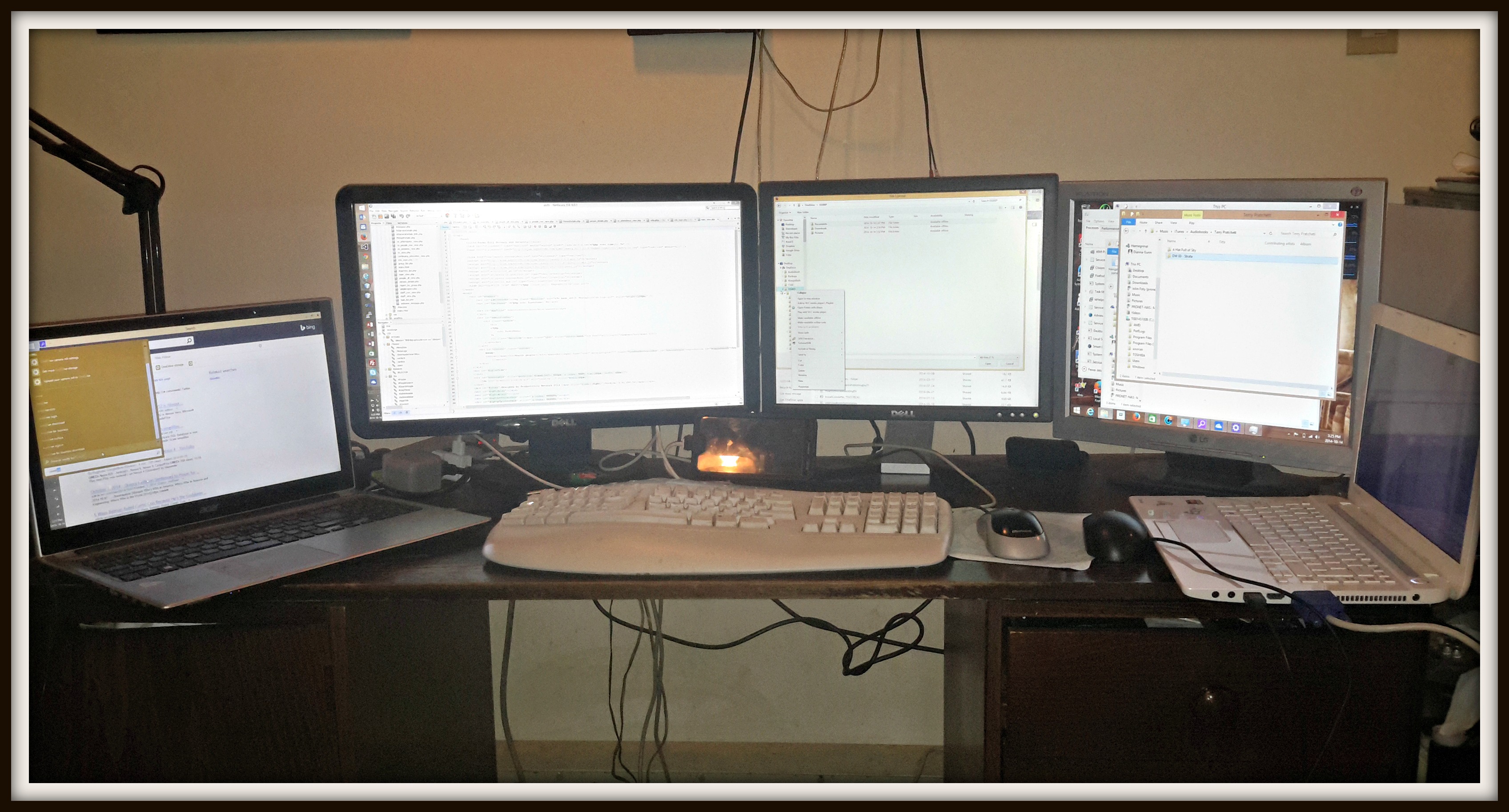 Today we have a picture of my desk at the office. To be fair I had a bit of an explosion of screens today. My work computer is the middle to monitors, on the left is the laptop I’ve been using to test Windows 10, and on the right is my nieces broken laptop I had brought to the office recover some of her files. Looking at the setup tonight, has me thinking that I should see if I can make it permanently.