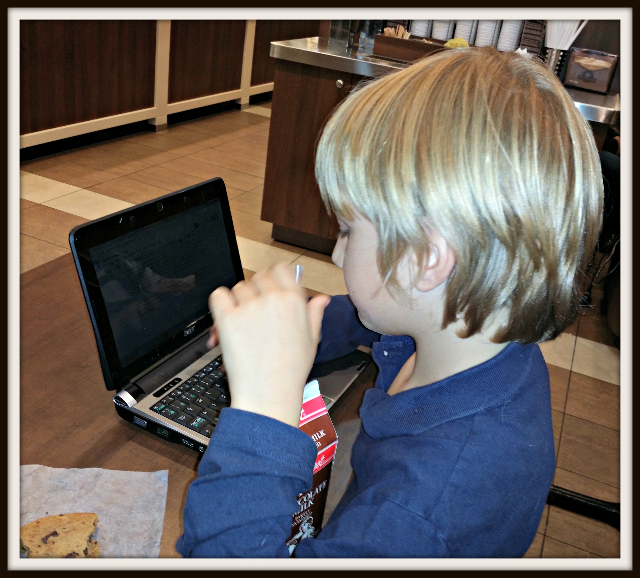 With Jacob still recovering from getting tubes in his ears, he was forced to miss swimming. So Jacob and I hit the Second Cup near swimming to work on our novels. It was a productive day, Jacob wrote another 300 words and I got close to 1000. Sure I’m still behind, but I had a great time with my boy.