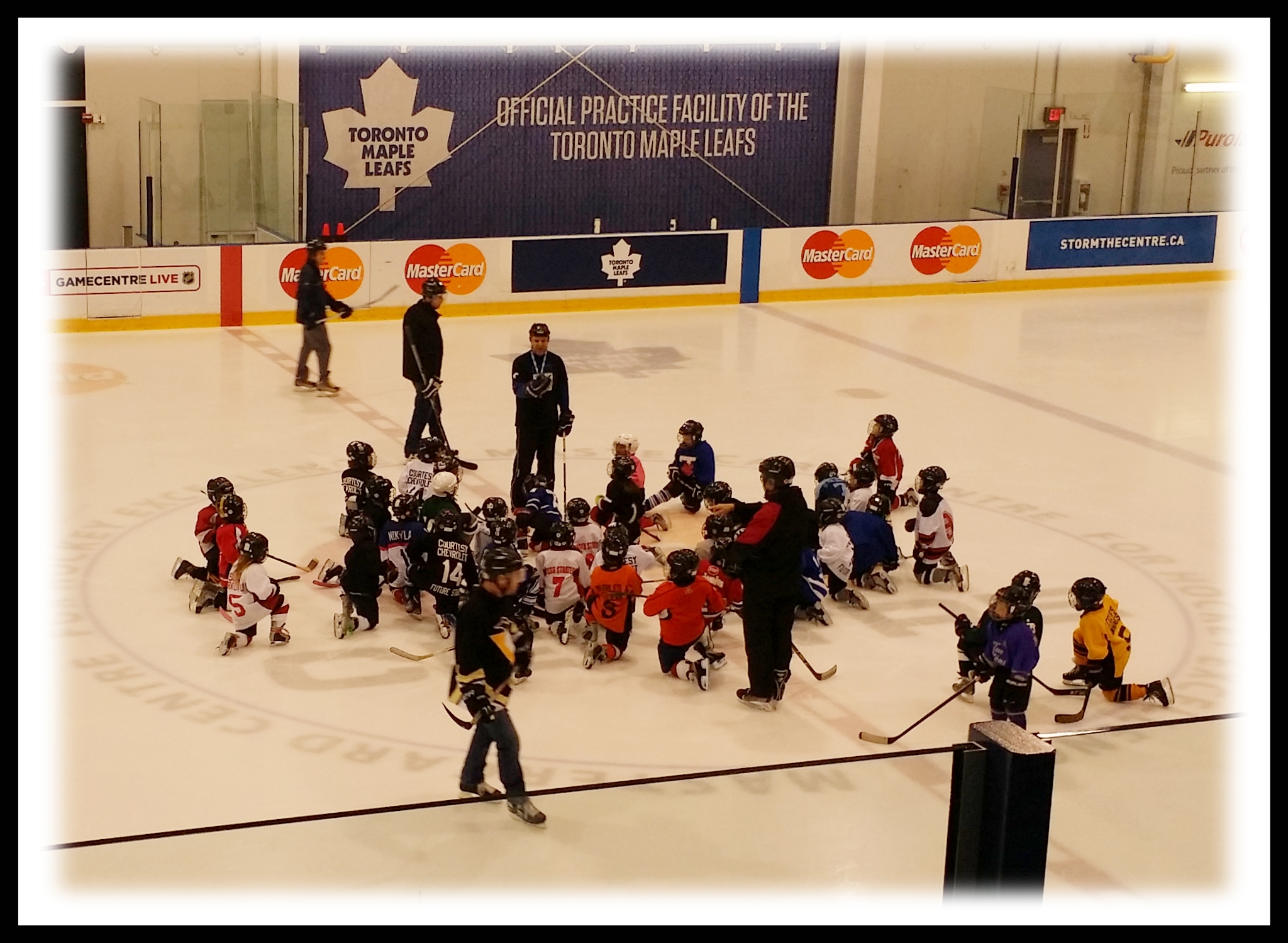 Early Sunday mornings is usually Hockey Practice for our little family. Today it was Violet’s turn, early in the practice I capture this image of the kids kneeling on the ice listening to the coach. Violet is there on the right in her number 5 jersey, trying to stay on one knee like the rest of the kids.