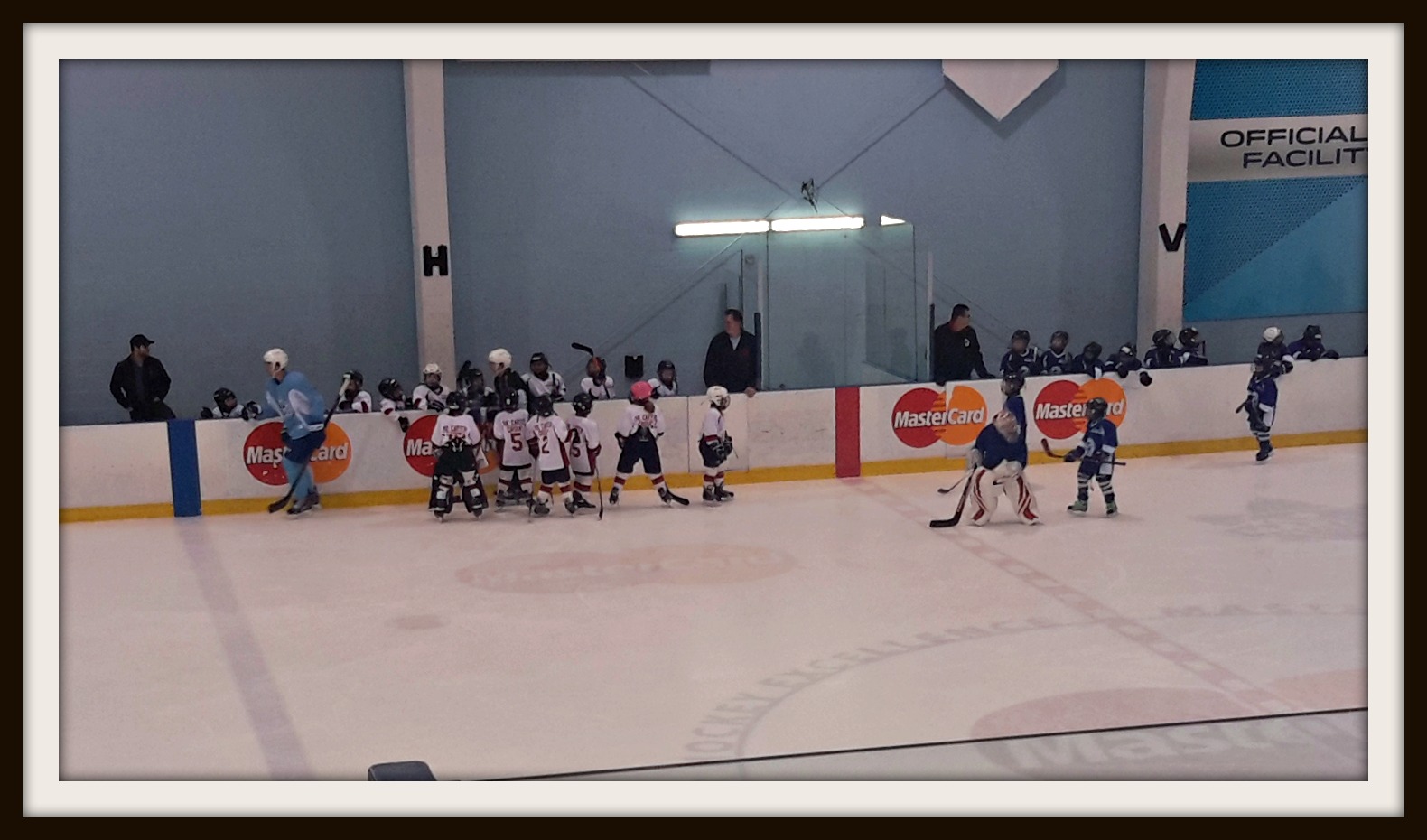Today during the kids hockey the Marlies interrupted play to skate from their dressing room to the other end of the ice so they could go practice on the Maple Leafs practice rink. Today’s picture is from when they returned. Jacob’s line was on the ice at the time and it was cool to see the players high-fiving the little guys.
