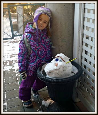 This morning as we headed off to school we were greeted by Violet’s little ‘Snow Bear’. I wanted to take a picture for today’s picture of the day, so she posed with her creation. As much as she insists that it is a snow bear the rest of the household thinks it looks more like a snow Angry Bird. either way it’s cute and I’m impressed with the ingenuity she showed picking the pieces for its Eyes, nose, mouth and even arms.