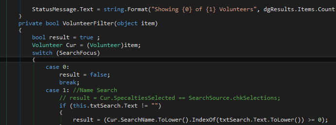 It felt really good to sit down and just write an application that serves a purpose. It also reminded me how much I enjoy writing for the desktop, where you have so much more control than the web. It also brings back a discussion I often have at work when we sit down to plan a new project. Do we do it as a web application or a desktop app. For the most part a web app has been the answer. This time I wanted to add some security to the search without having to have the users login, and a desktop application let me do that easily. It also let me revisit some coding solutions I’ve used in other projects and refine them.