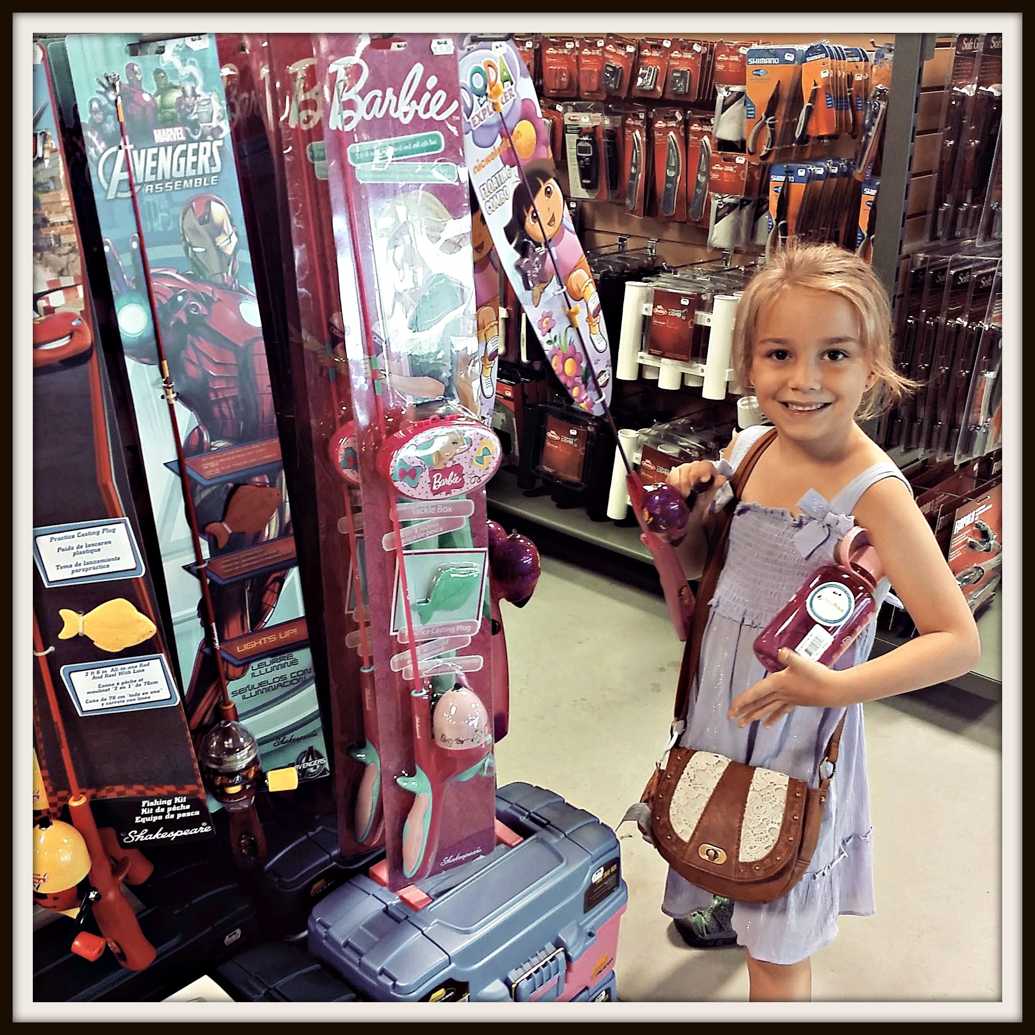 Today we were at Sail looking for camp supplies for the kids. While there Violet found the fishing rods. Well, not all kids are the same. Some kids like the outdoors, some kids don’t. She seemed really interested in them…
