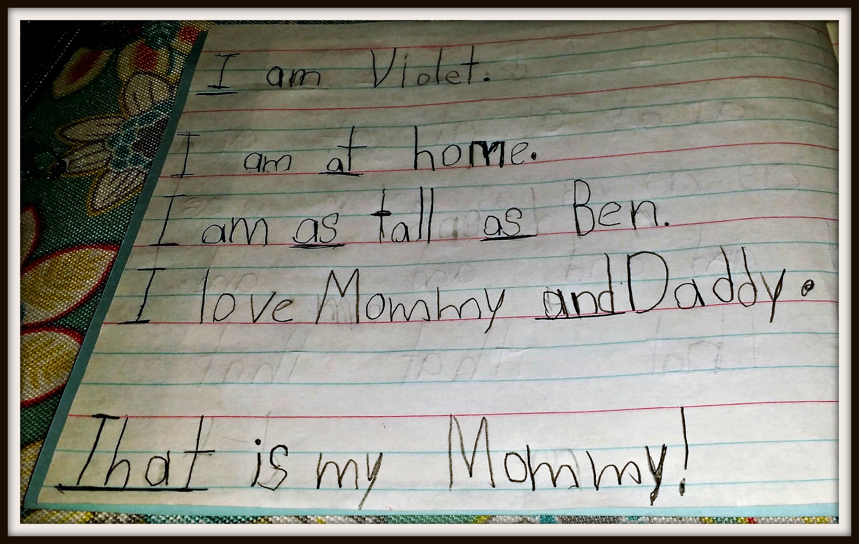 With everything going on this last week I haven’t had an opportunity to share some pictures of the kid’s school work. This year Violet is in grade run, so it means home work. Her first homework was Spelling words. Each day she has a different task to do with the words. I chose to take a picture of her sentence, I’m just so impressed with how well she is printing. What’s even better is watching the two of them sitting at the table after school both working on their homework. Perhaps in the coming weeks I can capture that as my picture of the day.