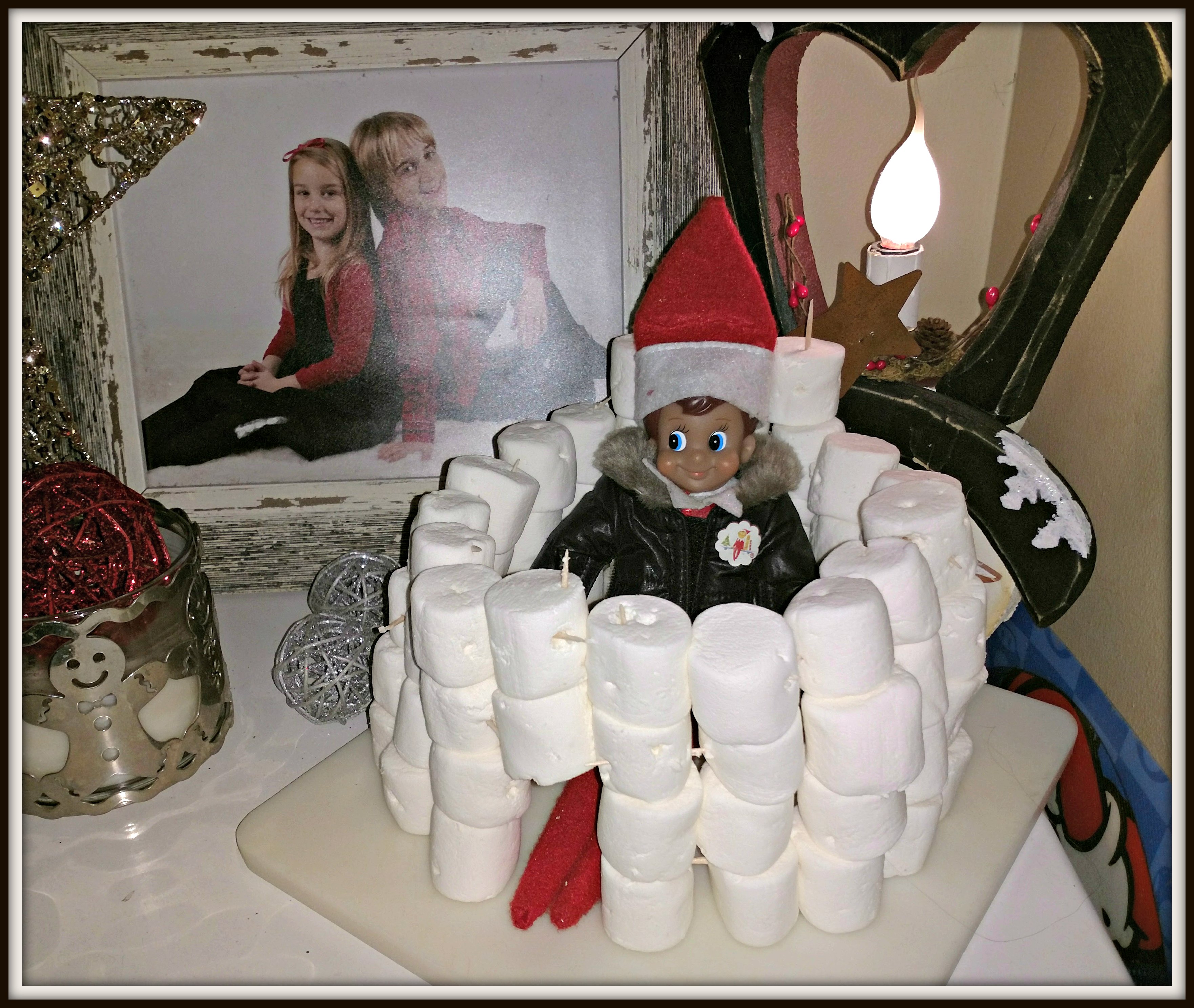 It seems our Elf on a Shelf was inspired by the kids time playing in the snow. With marshmallows and tooth picks he built is own ‘igloo’. Though it seems he ran out of marshmallows before he could finish.