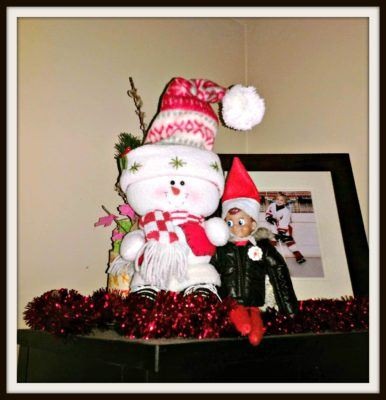 Tonight we have a picture of Jingles, hanging with one of our Christmas Snowmen. I couldn’t help but smile tonight as Violet looked up at Jingles to say goodnight before she ran up to bed. She really loves that little app.