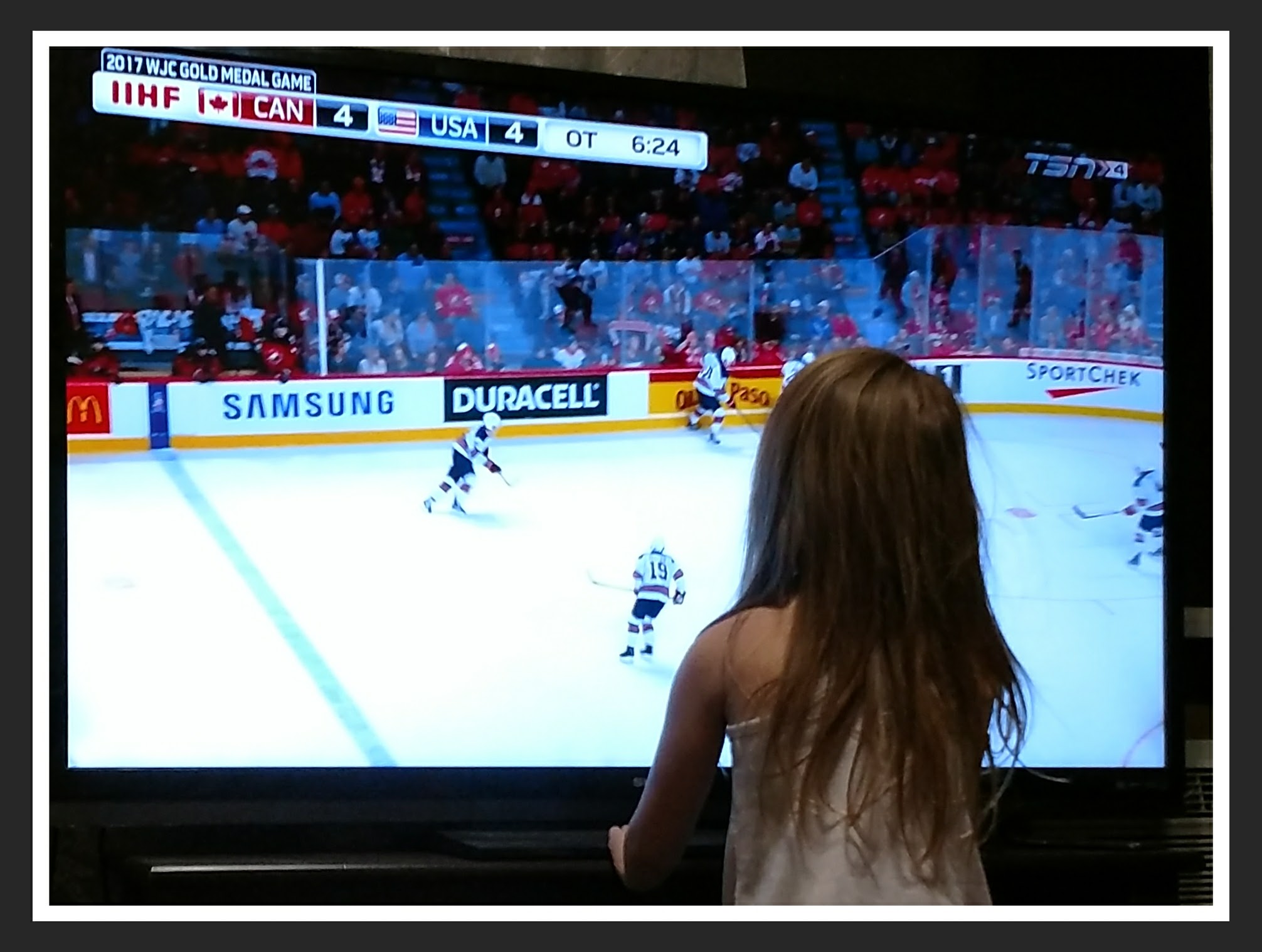 Tonight we have a picture of Violet as she watches the Gold Medal game of this year’s world Juniors. It was a great game, with an unfortunate ending (Canada lost in a shootout). Violet didn’t want to go to bed till it was over.