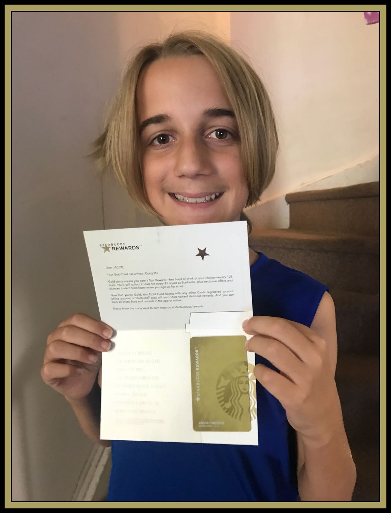 POD: Gold Card for Jacob Posted on August 20, 2018by mrjCategories:Family, Picture of the Day I knew Jacob enjoyed his Starbucks before school (Apple juice and Chocolate Chunk cookie) but I didn’t know just how much. He seems really proud of his new Gold Starbucks card. Share this: Click to share on Facebook (Opens in new window) Facebook Click to share on X (Opens in new window) X Like this:Like Loading... Related mrj www.geekwithkids.com