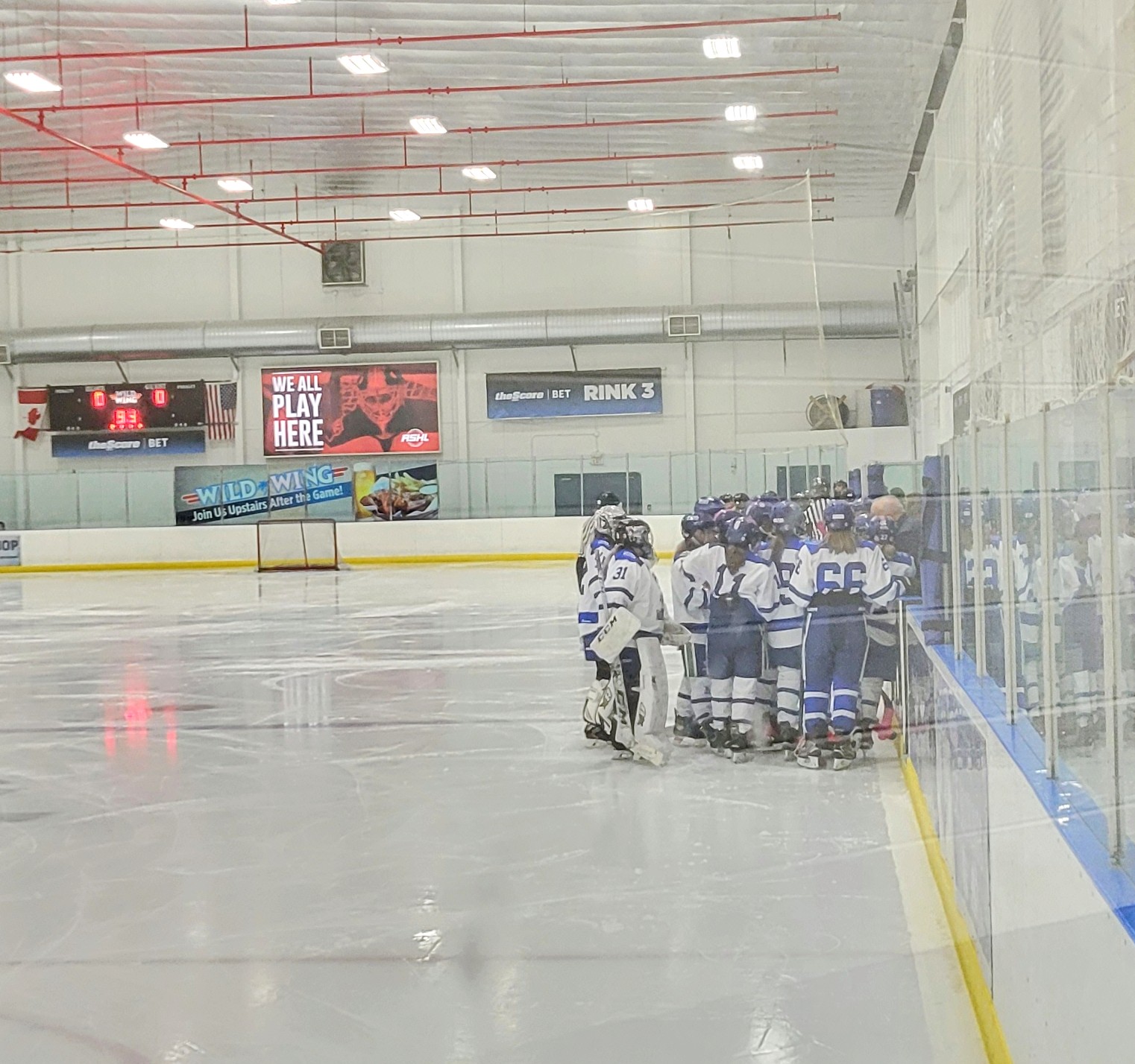First day of Pink the Rink tournament. So for my POD today I have a picture of the team huddled up with the coach before the start of the second game. The games didn’t go as well as they would have liked. Loosing the first 3-0. And the second 2-1.