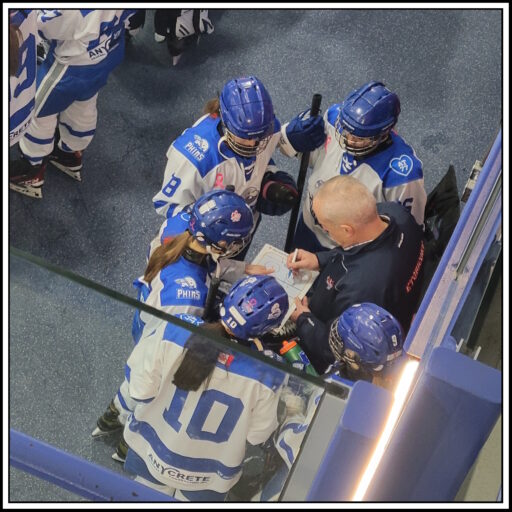 I captured today’s picture of the day during Violet’s hockey game, between the second and third periods, as the Zamboni was finishing up. It seems the coach has a little extra instruction for the line starting the third period. Violet’s team played hard but lost 1-0.