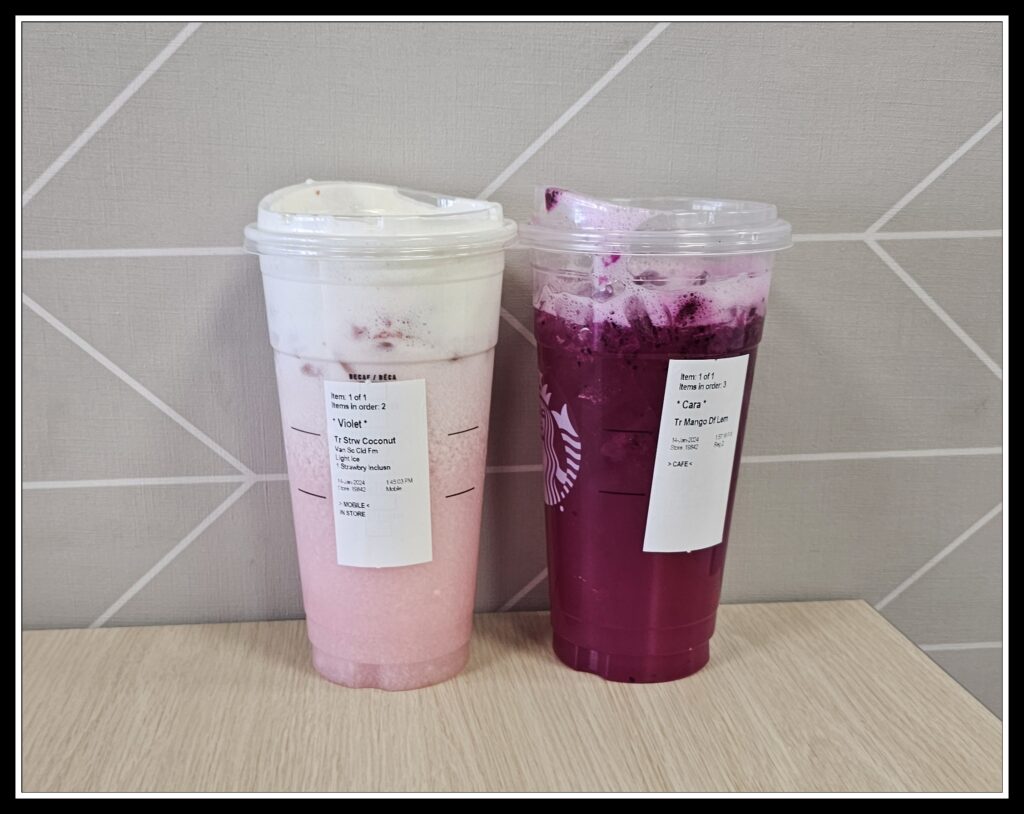 Today, we have a picture of two Starbucks drinks we picked up this morning. It was a little treat for Violet and one of her friends (One of her friends had to head jome early, so she didn’t get Starbucks) after a successful birthday, Sleepover.