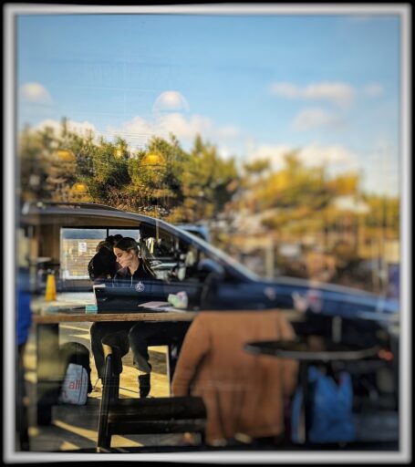 Today’s picture of the day is a neat one. I captured it while dropping off some of Violets dance shoes to her while she did home worknat Starbucks before her evening dance classes. I took the picture as we drove around Starbucks and could see Violet in the window. I love how only she is visible through the windows, and the rest is reflection.