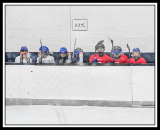 Another day at the arena, so why not another picture from practice for my Picture of the Day. I thought I had a great picture of Violet staring at me from the ice, asking why I was taking pictures, but It just didn’t turn out. So instead I have a picture of her and her line mates sitting on the bench between drills.