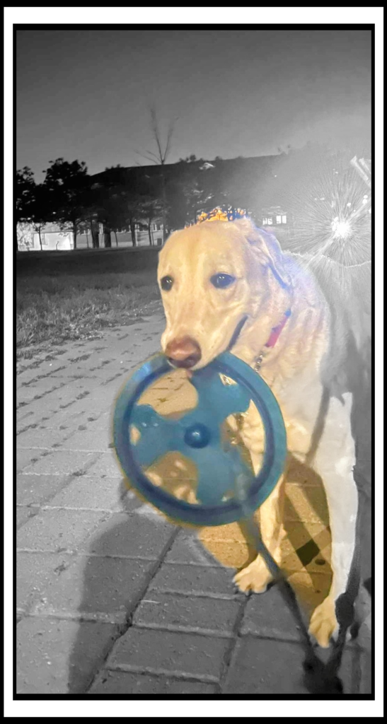 Tonight I head for a walk with Ruby, she insisted on bringing her Fribby and I couldn’t help but through it a few times for her. Of course once we were done she showed that she can chase her Fribby like she used to, but she just loves it.