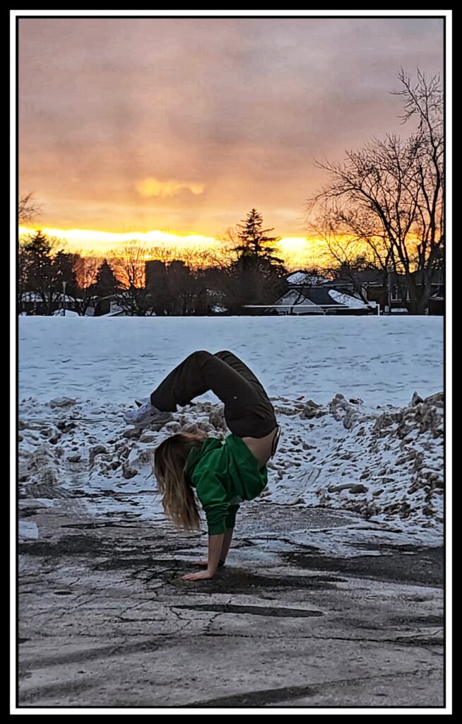 Today’s picture of the day was captured after Ball Hockey. She’s just so happy to back to her regular activities. She was inspired to do some gymnastics with the sun setting backdrop.